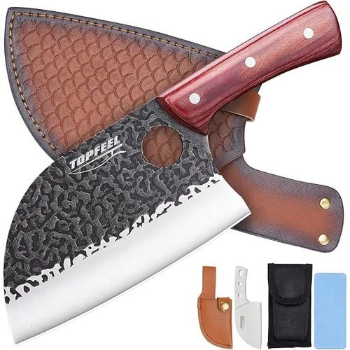 • 【Hand Forged Meat Cleaver】Our razor-sharp butcher knives is hand forged by craftsmen with more than 50 years of experience. It is formed through a series of continuous operation cycles, including quenching, hammering, tempering, clamping so that it can be keeped the blade sharp for a long time, helping you cut food effortlessly. Forged Knife exclusive anti-rust process means your knife will last longer.