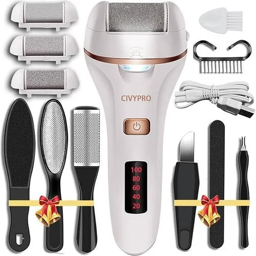 β’ β 13 IN 1 EFFICIENT PEDICURE KIT – The pedicure supplies set includes a electric foot exfoliator, charging cable, three replacement roller heads (1 pre-installed roller and 2 additional rollers), a cleansing brush, and 7 piece exfoliating foot care kits. This professional foot care kit is made to accommodate your various demands without requiring you to spend more money or time at the salon.