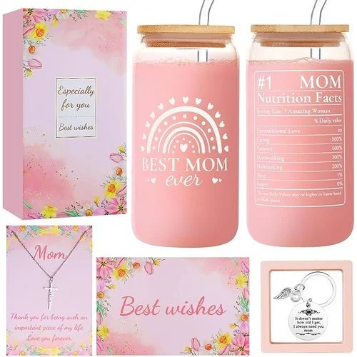 β’ Premium Mom Gift Set: This beautiful set includes a 16 oz glass cup with lid, glass straw, straw brush, cross “MOM” necklace, keychain with flip-top box, and a blessing greeting card. A thoughtful gift to show you’re always thinking of Mom
