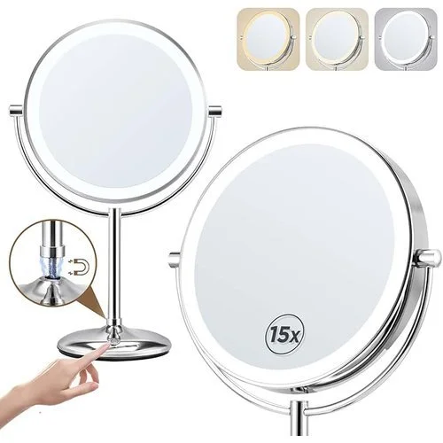 • 15X/1X DOUBLE SIDED MAGNIFYING MIRROR: Desktop lighted makeup mirror typically features a dual-sided design, with one side offering a standard 1x magnification for everyday use and the other side providing a 15x magnification for detailed work. When using the 15x magnification side of the makeup mirror, it is important to maintain a distance of less than 3 inches from the mirror to avoid dizziness.