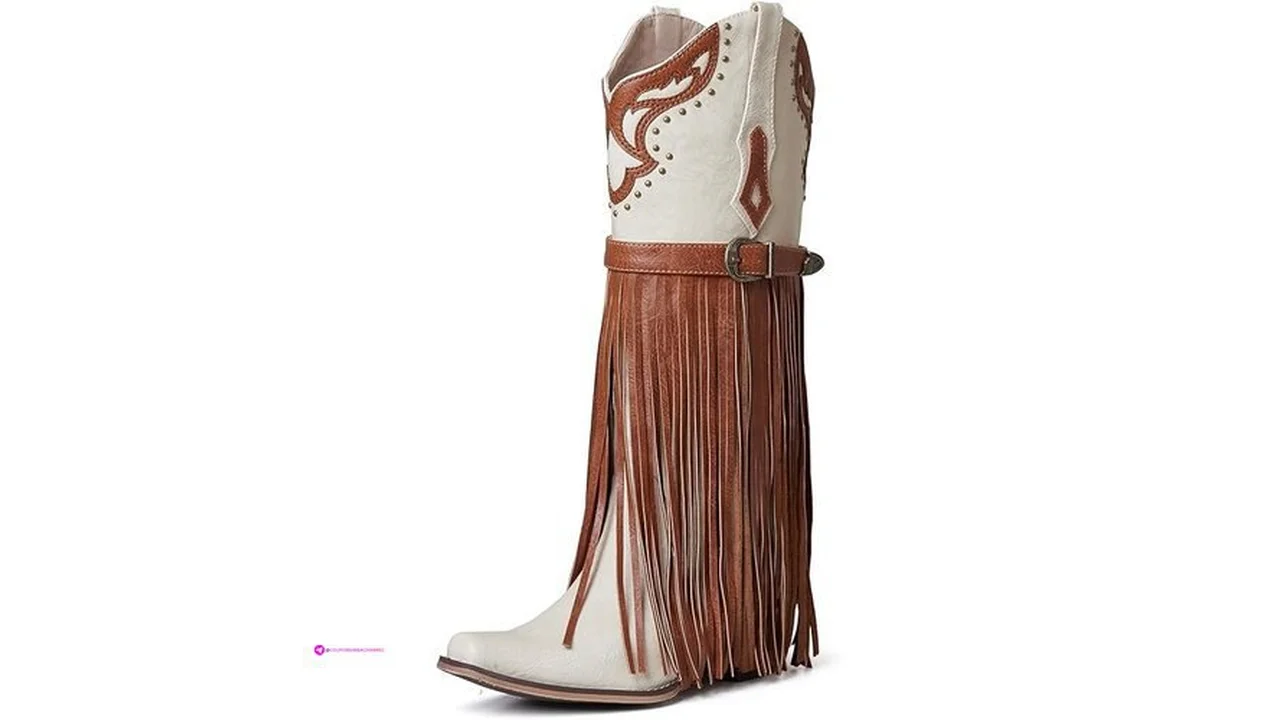 $34.99 SaraIris Women’s Western Bootie, Fashion Pointed Toe, Chunky Heel, Embroidered, Fringe, Pull-On, Mid Calf Boots, 2.75 inches, Knee High, PU, Denim, Rubber