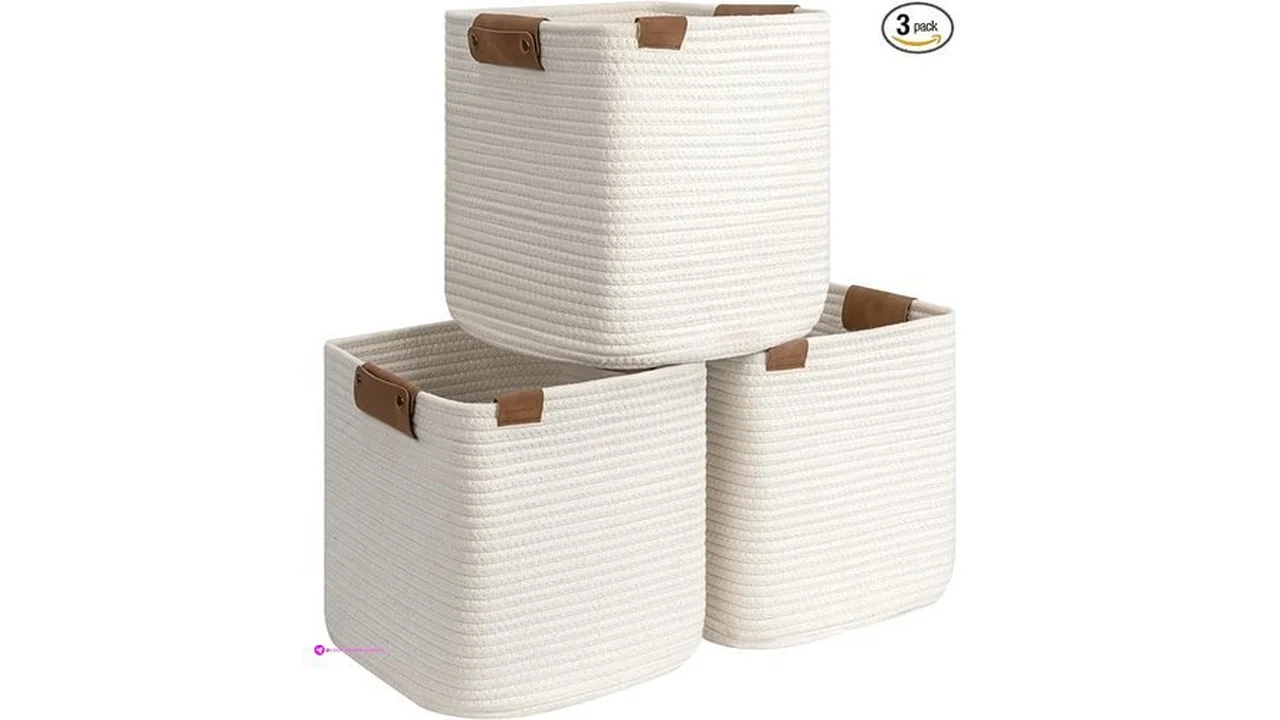 $18.99 StorageWorks White Woven Baskets, Cotton Rope Basket with Leather Decoration, Storage Organizer for Shelves, Closest, Living Room,11 inch, 3 Pack